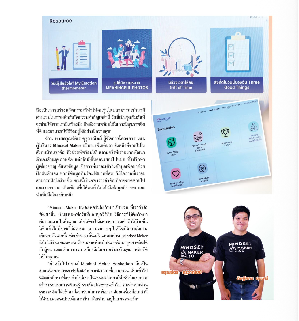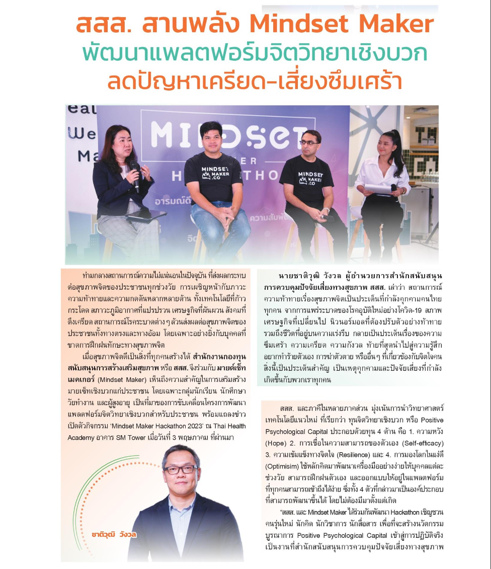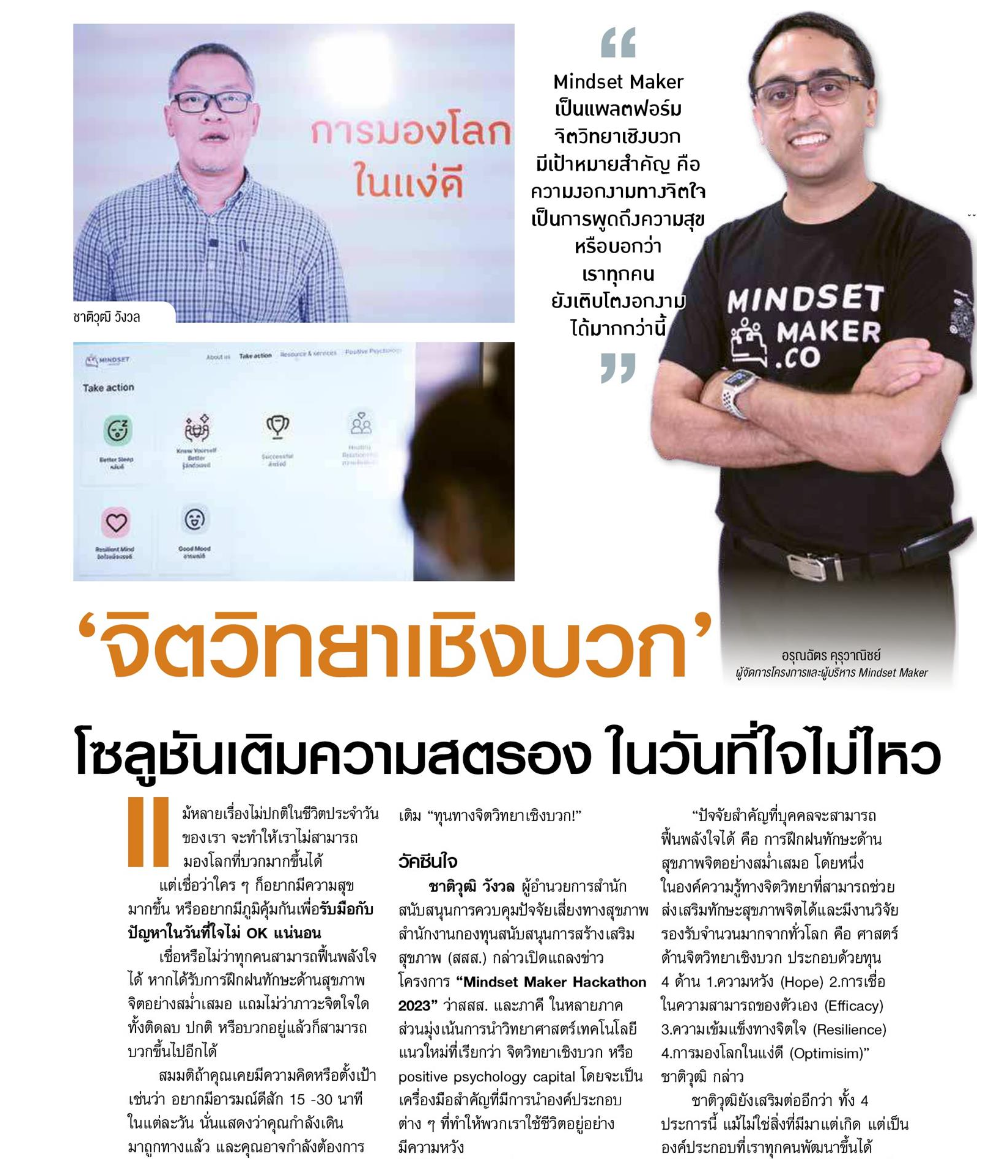 การรวมพลังมุ่งเน้นการนำวิทยาศาสตร์ เทคโนโลยีแนวใหม่ มาพัฒนาทุนทางจิตวิทยาเชิงบวก (Positive Psychology Capital) มาออกแบบให้อยู่ในรูปแบบที่คนธรรมดาทั่ว ๆ ไป เข้าถึงได้ในทุกวัน (Ready to Use) โดยร่วมกันพัฒนาในกิจกรรม "Mindset Maker Hackathon 2023" โดยผ่านกรอบแนวคิดที่ได้รับการยอมรับในระดับนานาชาติ ได้แก่ PERMA Model + H ซึ่งมุ่งเน้นในการสร้างเสริมสุขภาวะให้ผู้คนในแต่ละด้านในชีวิตประจำวันตั้งแต่ การมีอารมณ์เชิงบวก การมีส่วนร่วมในตัวเอง การมีความสัมพันธ์ที่ดี การตระหนักในเรื่องความหมายและคุณค่าการรู้จักตัวเอง การตระหนักในความสำเร็จของแต่ละย่างก้าวของตัวเอง รวมไปถึงเรื่องสุขภาวะด้านการนอนหลับ ซึ่งแต่ละส่วนประกอบที่กล่าวมานั้นมีเป็นพื้นฐานอยู่ในตัวเรา และฝึกฝนให้ดียิ่งขึ้นได้ "เพื่อตัวเราที่งอกงามขึ้นได้ในทุกวัน"