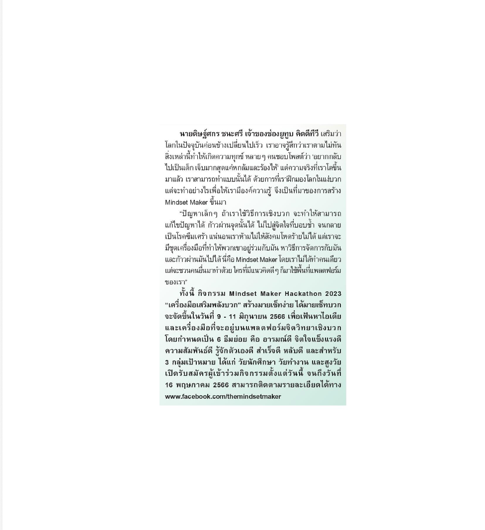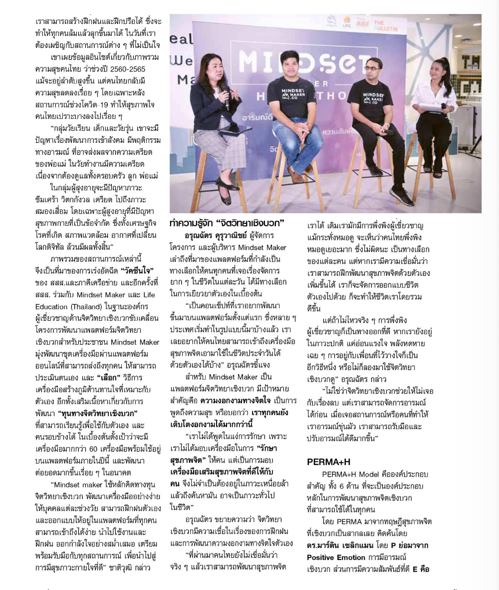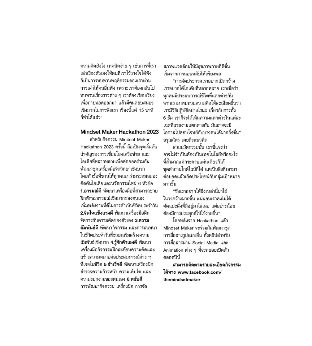 การรวมพลังมุ่งเน้นการนำวิทยาศาสตร์ เทคโนโลยีแนวใหม่ มาพัฒนาทุนทางจิตวิทยาเชิงบวก (Positive Psychology Capital) มาออกแบบให้อยู่ในรูปแบบที่คนธรรมดาทั่ว ๆ ไป เข้าถึงได้ในทุกวัน (Ready to Use) โดยร่วมกันพัฒนาในกิจกรรม "Mindset Maker Hackathon 2023" โดยผ่านกรอบแนวคิดที่ได้รับการยอมรับในระดับนานาชาติ ได้แก่ PERMA Model + H ซึ่งมุ่งเน้นในการสร้างเสริมสุขภาวะให้ผู้คนในแต่ละด้านในชีวิตประจำวันตั้งแต่ การมีอารมณ์เชิงบวก การมีส่วนร่วมในตัวเอง การมีความสัมพันธ์ที่ดี การตระหนักในเรื่องความหมายและคุณค่าการรู้จักตัวเอง การตระหนักในความสำเร็จของแต่ละย่างก้าวของตัวเอง รวมไปถึงเรื่องสุขภาวะด้านการนอนหลับ ซึ่งแต่ละส่วนประกอบที่กล่าวมานั้นมีเป็นพื้นฐานอยู่ในตัวเรา และฝึกฝนให้ดียิ่งขึ้นได้ "เพื่อตัวเราที่งอกงามขึ้นได้ในทุกวัน"